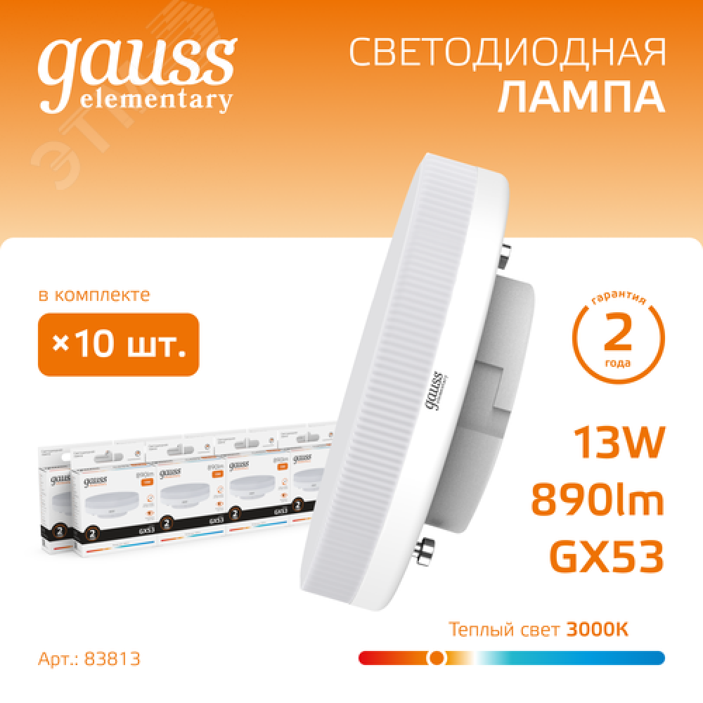 Технические характеристики Лампа светодиодная LED 13 Вт 890 лм 3000К таблетка теплый GX53 AC 220В Elementary