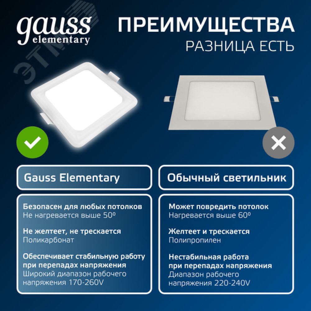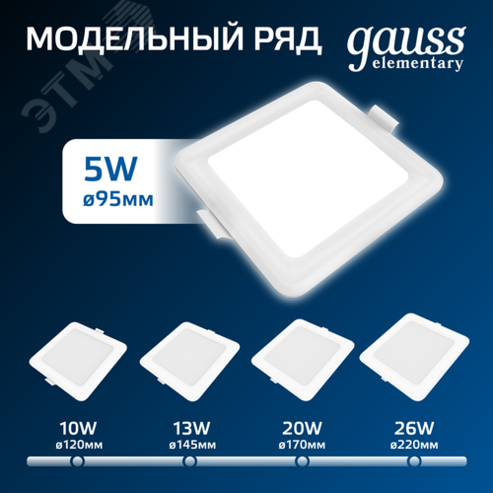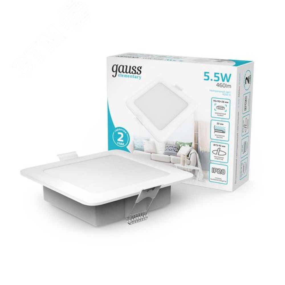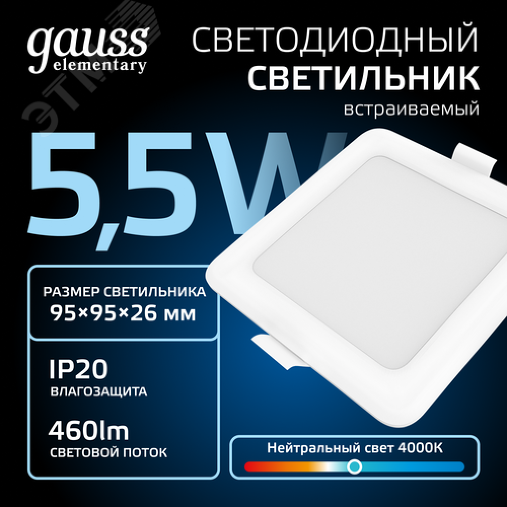 Технические характеристики Светильник светодиодный ДВО 5.5 Вт 460 лм 4000К AC 220В IP20 квадрат 95х95х26мм монт разм 75х75мм Пластик Elementary