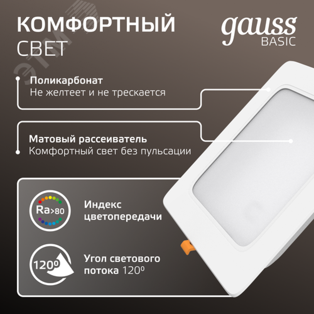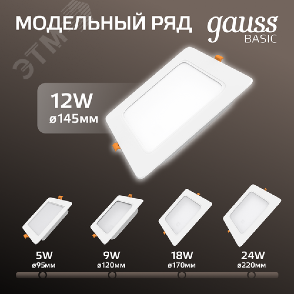 Технические характеристики Светильник светодиодный ДВО 12 Вт 1000 лм 4000К AC 220В IP20 квадрат 145х145х26мм монт разм 120х120мм Пластик Basic