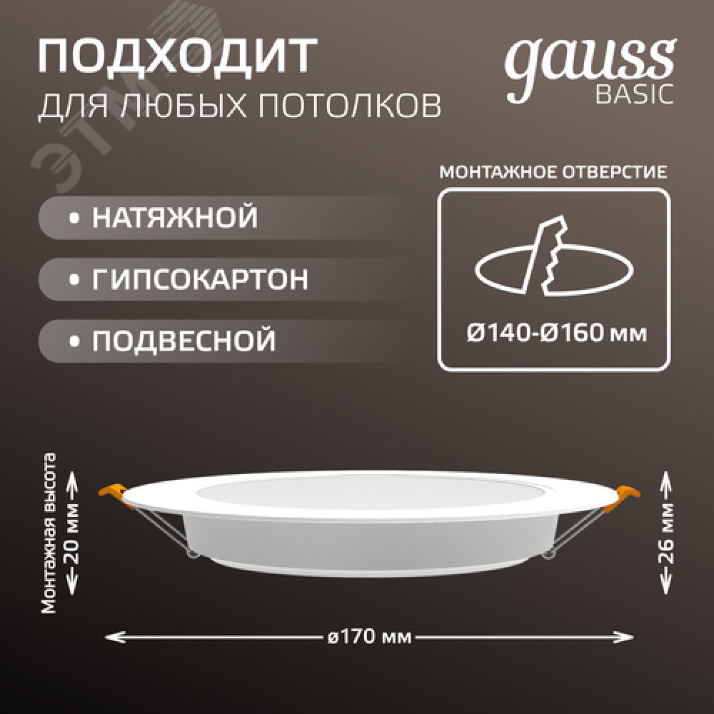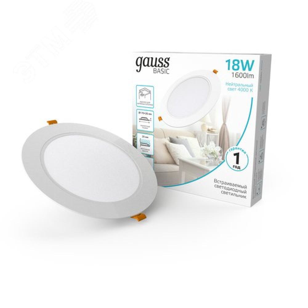 Технические характеристики Светильник светодиодный ДВО 18 Вт 1600 лм 4000К AC 220В IP20 круг D170х26мм монт d140мм Пластик Basic