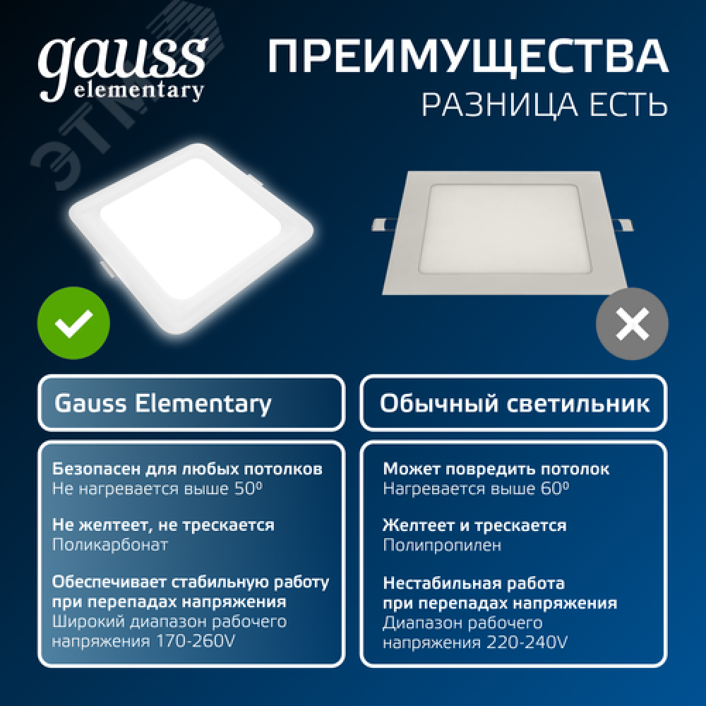 Технические характеристики Светильник светодиодный ДВО 20 Вт 1700 лм 4000К AC 220В IP20 квадрат 170х170х26мм монт разм 140х140мм Пластик Elementary