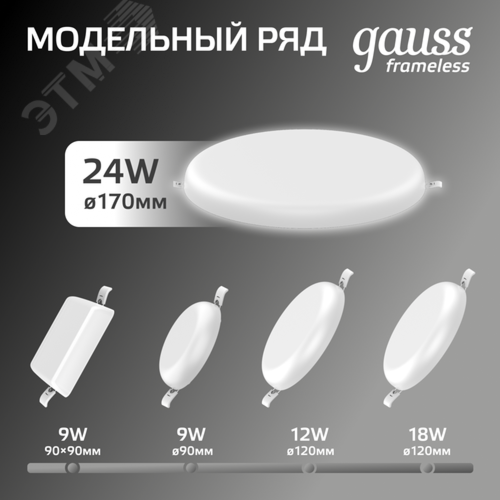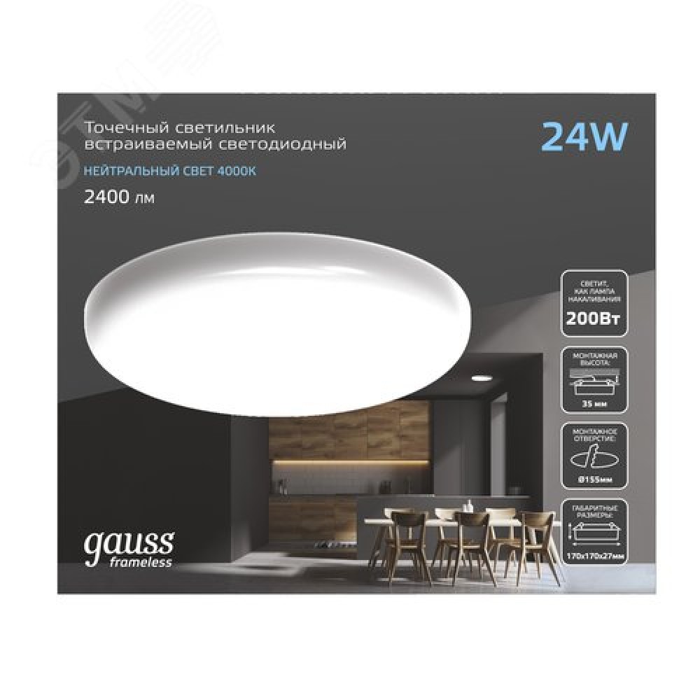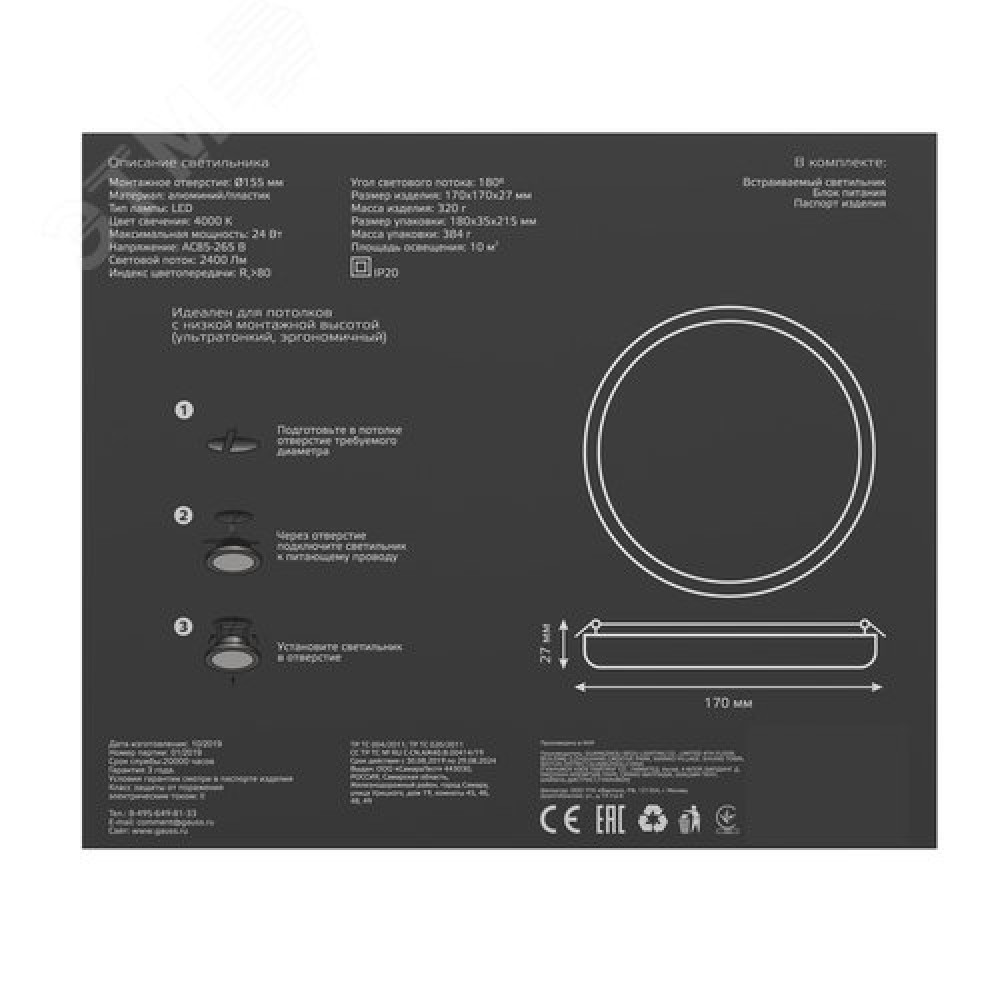 Технические характеристики Светильник светодиодный ДВО 24 Вт 2400 Лм 4000К AC 220В IP20 круг D 170х27 мм, монтажный d 155 мм пластик безрамочный Frameless