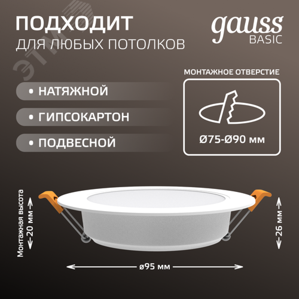 Светильник светодиодный ДВО 4.5 Вт 300 лм 4000К AC 220В IP20 круг D95х26мм монт d75мм Пластик Basic 0 132 ₽