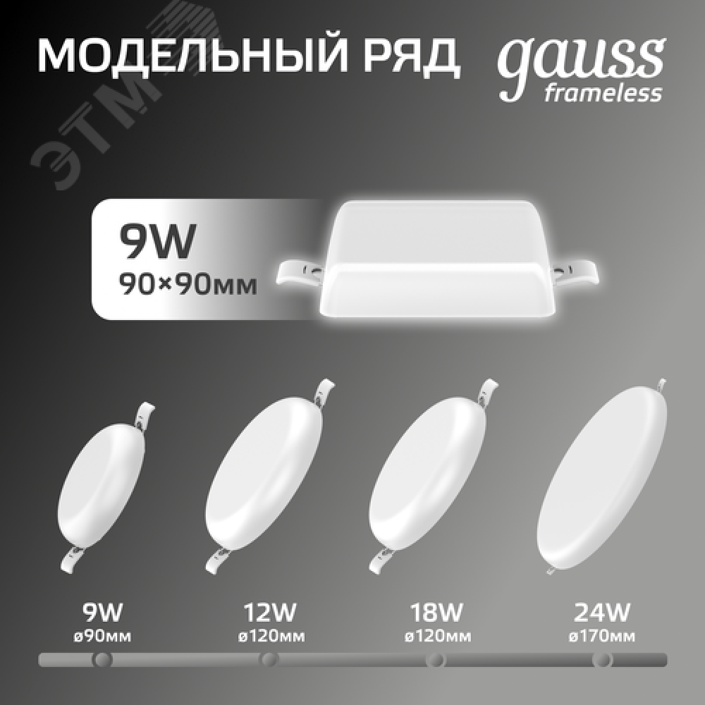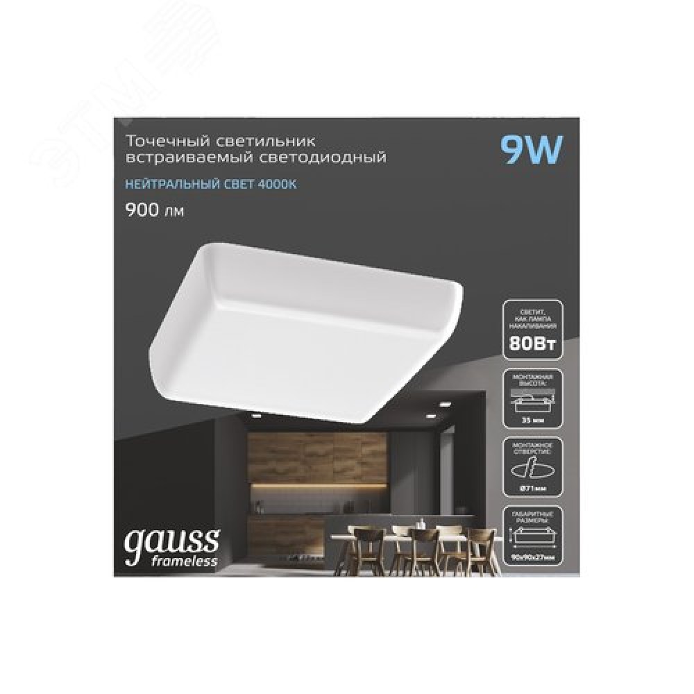 Технические характеристики Светильник светодиодный ДВО 9 Вт 900 лм 4000К AC 220В IP20 квадрат 90х27х27мм монт разм 71х25мм Пластик безрамочный Frameless
