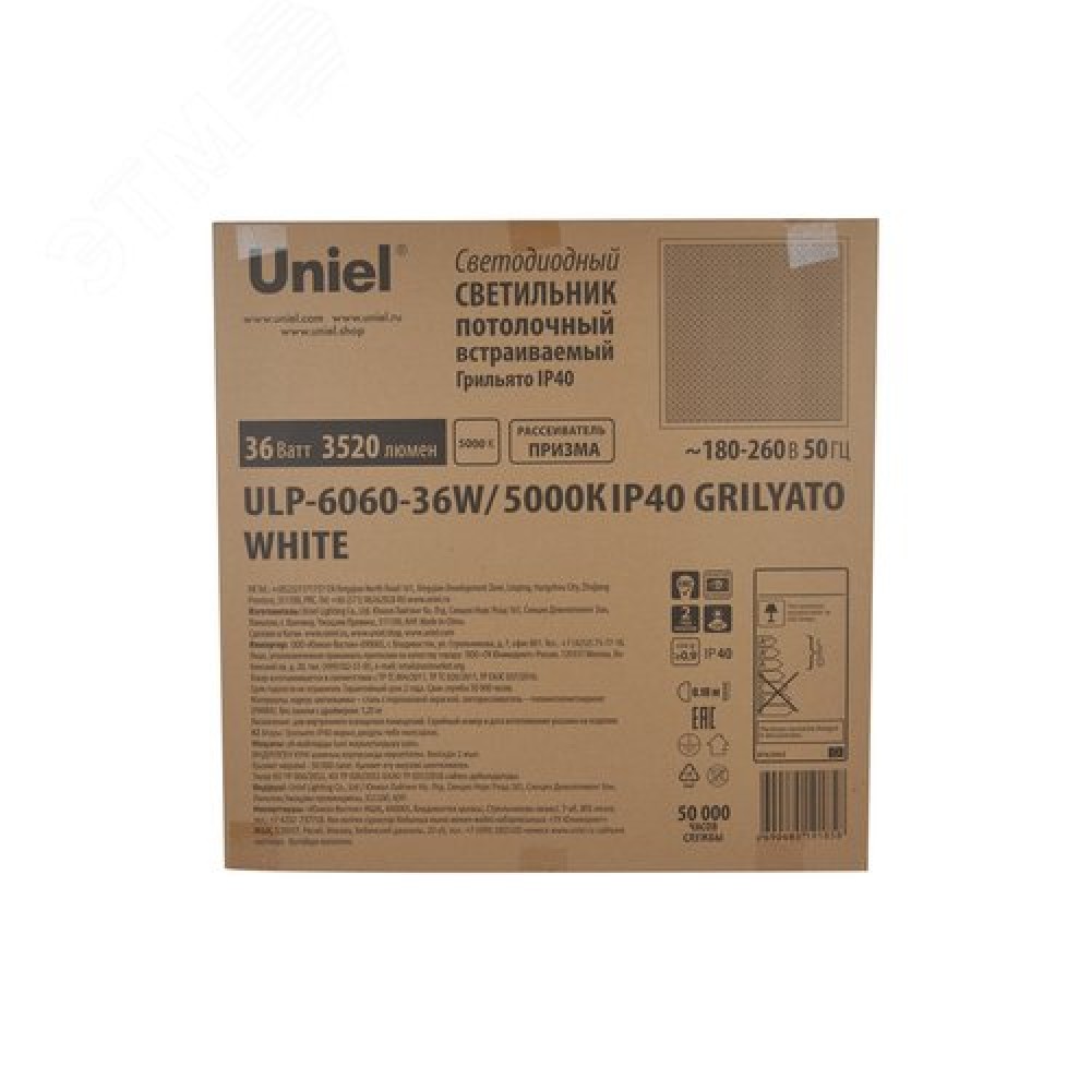 Технические характеристики Светильник светодиодный потолочный универсальный Грильято Белый свет 5000K 3520Лм 588X588x25мм Корпус белый В комплекте с источником питания ТМ ULP-6060-36W/5000К IP40 GRILYATO WHITE