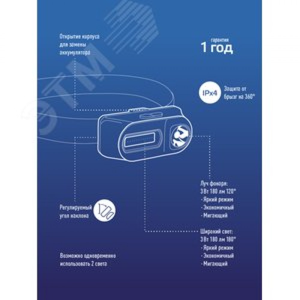 Технические характеристики Фонарь налобный аккумуляторный, 3W, аккумулятор 3,7V 1,2Ah, 180Lm, 8 часов