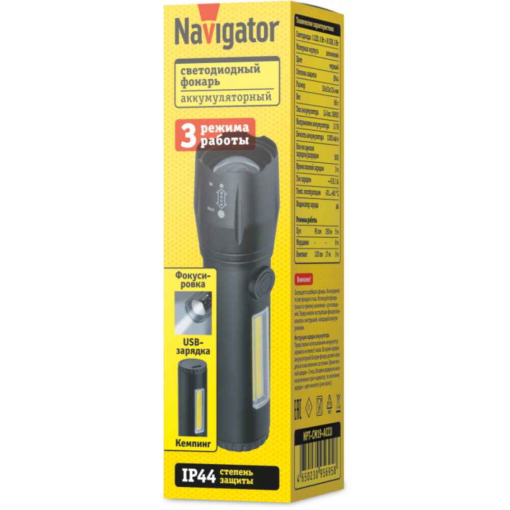 Технические характеристики Фонарь светодиодный ручной 95 695 NPT-CM19-ACCU алюм.3 реж 1LED 3Вт+8COB 3Вт Li-ion 3.7В NAVIGATOR 95695