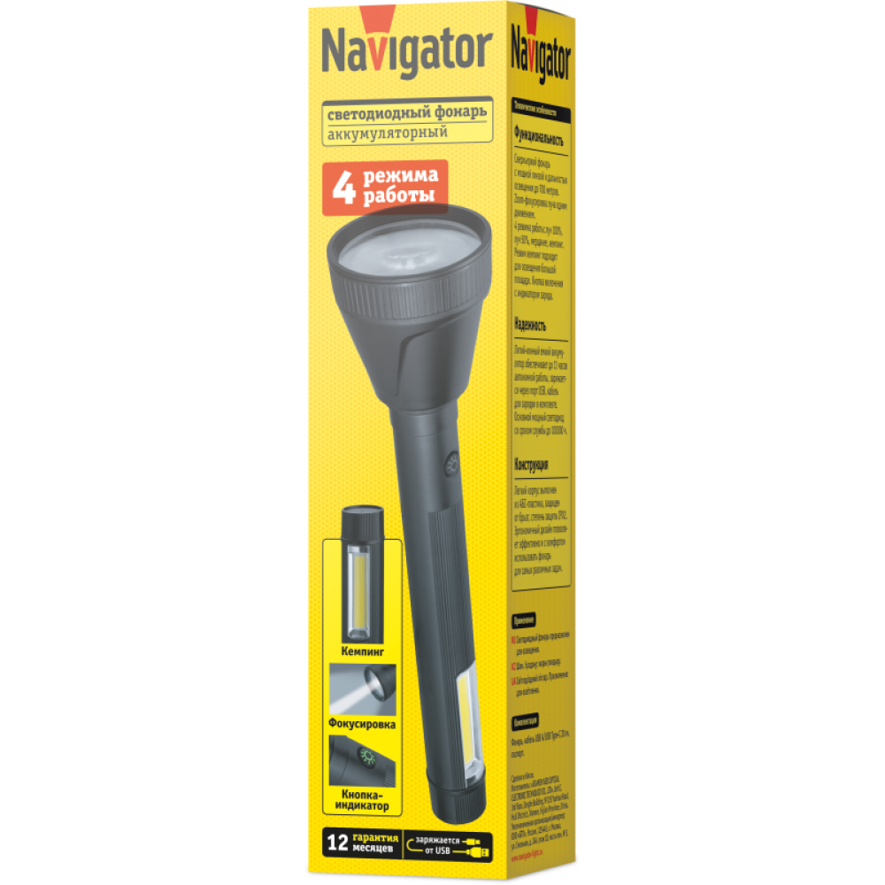 Технические характеристики Фонарь светодиодный ручной 95 740 NPT-CP31-ACCU пласт. 1LED 10Вт+1COB 2Вт Li-Ion 2А.ч 4реж NAVIGATOR 95740