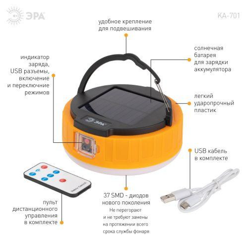 Технические характеристики Фонарь аккумуляторный кемпинговый KA-701 Персей на солнечной батарее + ДУ Эра Б0054044