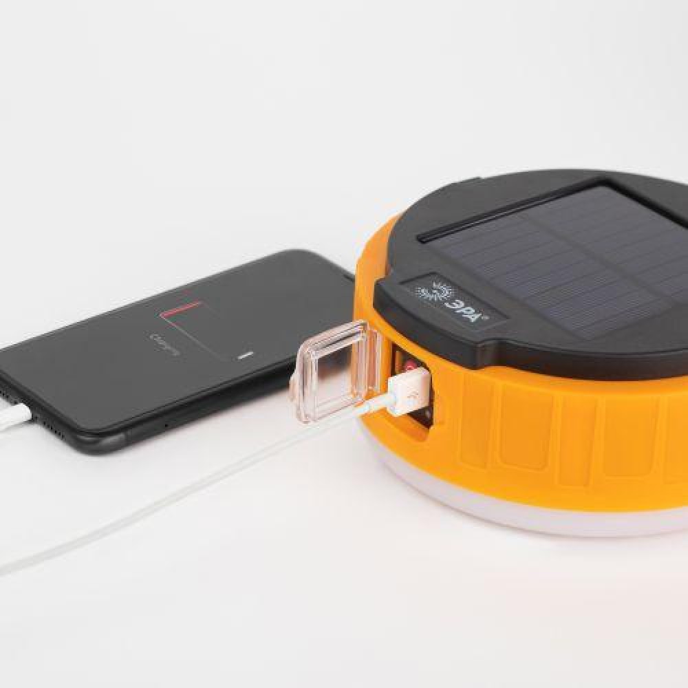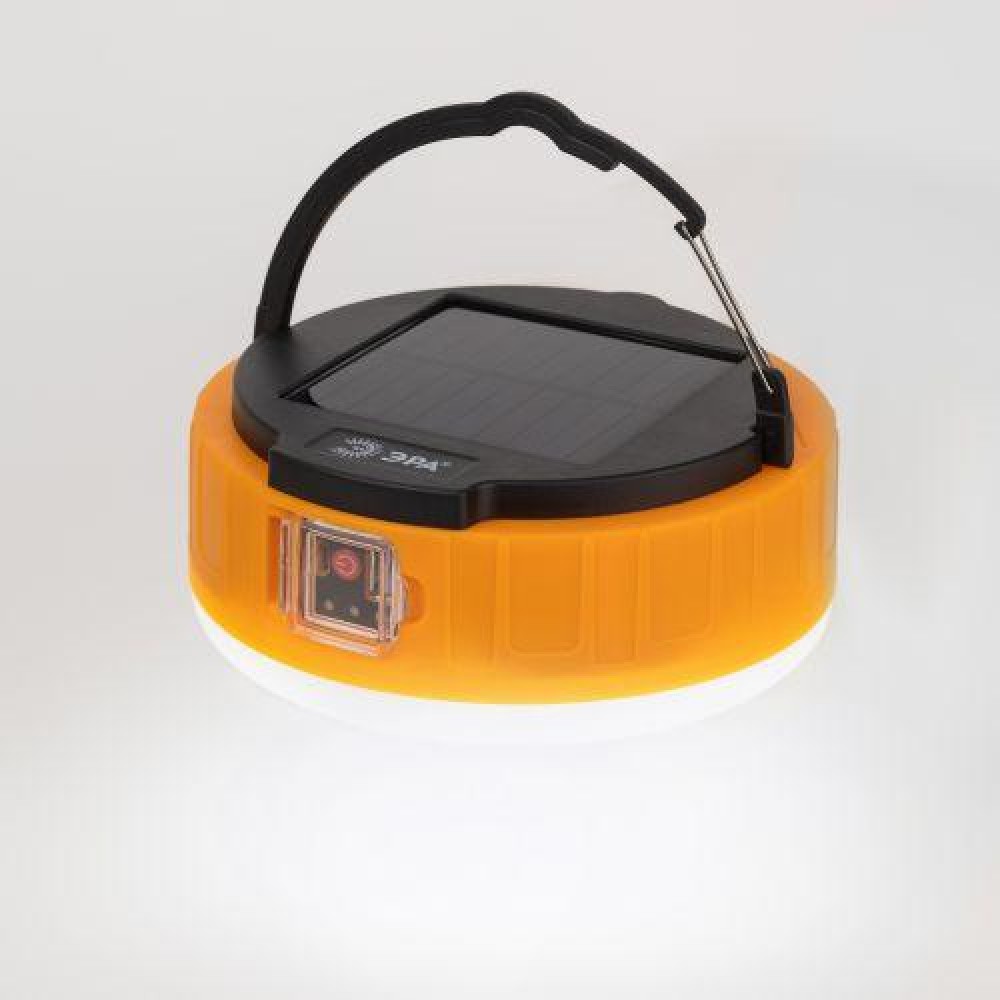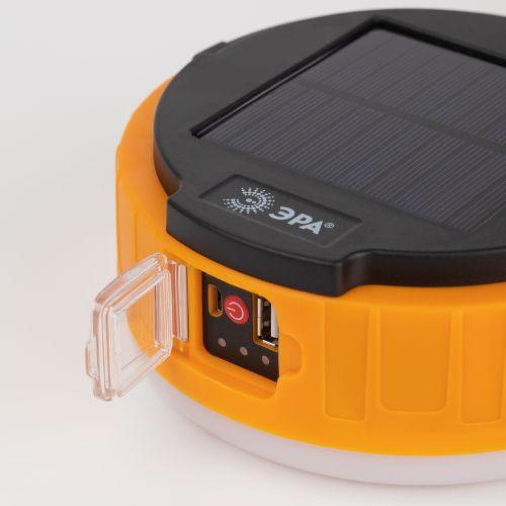 ЭРА КА-701 «Персей» – современный фонарь для кемпинга со встроенной солнечной батареей и пультом дистанционного управления. Аккумуляторный фонарь ЭРА «Персей» также заряжается от USB (кабель в комплекте). От одной зарядки непрерывно проработает 12 часов. Может использоваться в качестве powerbank – в условиях похода выручит, если нужно подзарядить телефон или другой мобильный гаджет. Мигающий 3-сегментный индикатор покажет уровень заряда аккумулятора. Разъёмы для зарядки фонаря и телефона, а также кнопка включения и управления режимами освещения, спрятаны в специальном отсеке под прозрачной пластиковой крышкой.