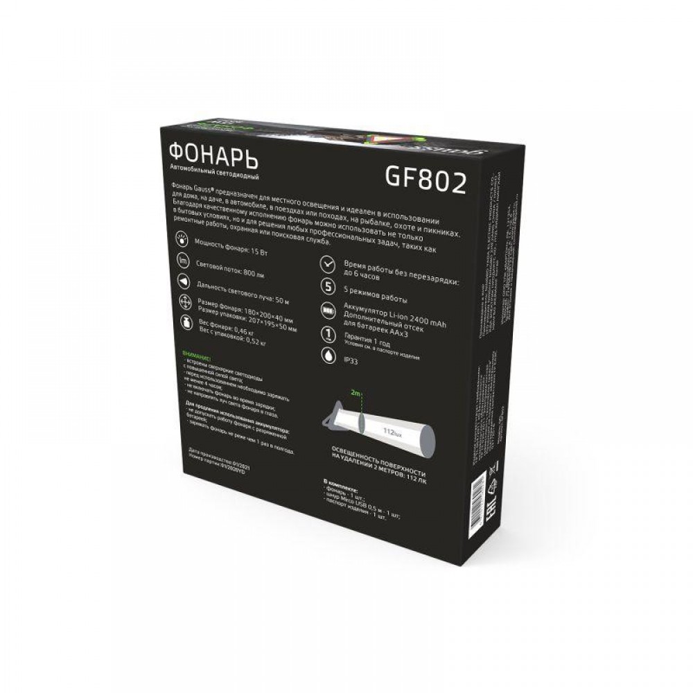 Технические характеристики Фонарь автомобильный аккумуляторный GFL 15Вт 800лм IP33 аккум. Li-ion 2400мА.ч Power Bank GAUSS GF802