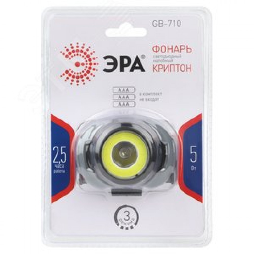 Технические характеристики Фонарь налобный светодиодный 5Вт 310Лм IP40 SMD+COB 3 режима на батарейках 3xAAA (в комплект не входят) GB-710 Криптон