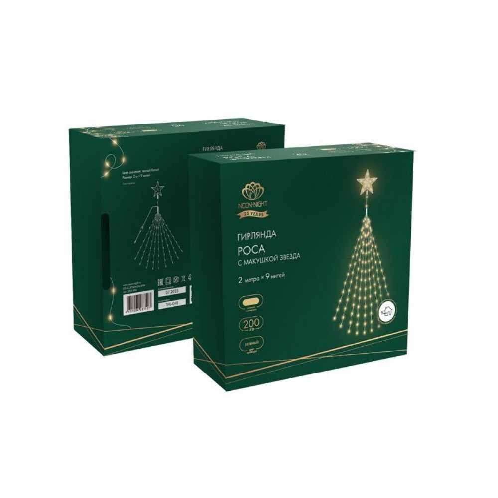 Технические характеристики Гирлянда светодиодная из росы с макушкой на елку 9 нитейх2м 200LED тепл. бел. эффект водопада 230В Neon-Night 315-896