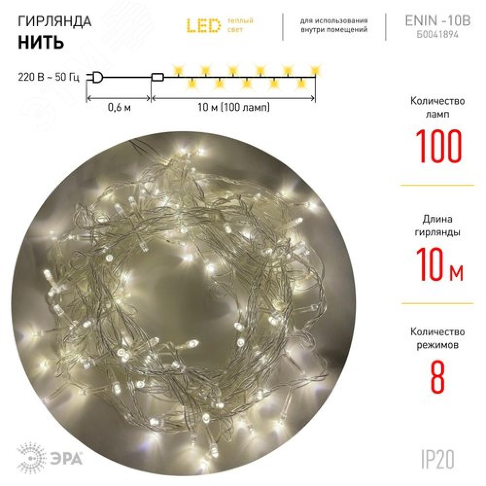 Гирлянда LED Нить 10 м ENIN-10B теплый свет 8 режимов, 220 V, IP20 60/720