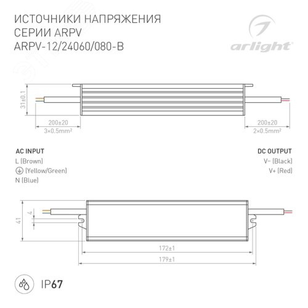 Технические характеристики Блок питания ARPV-24060-B (24V, 2.5A, 60W) (ARL, IP67 Металл, 3 года)