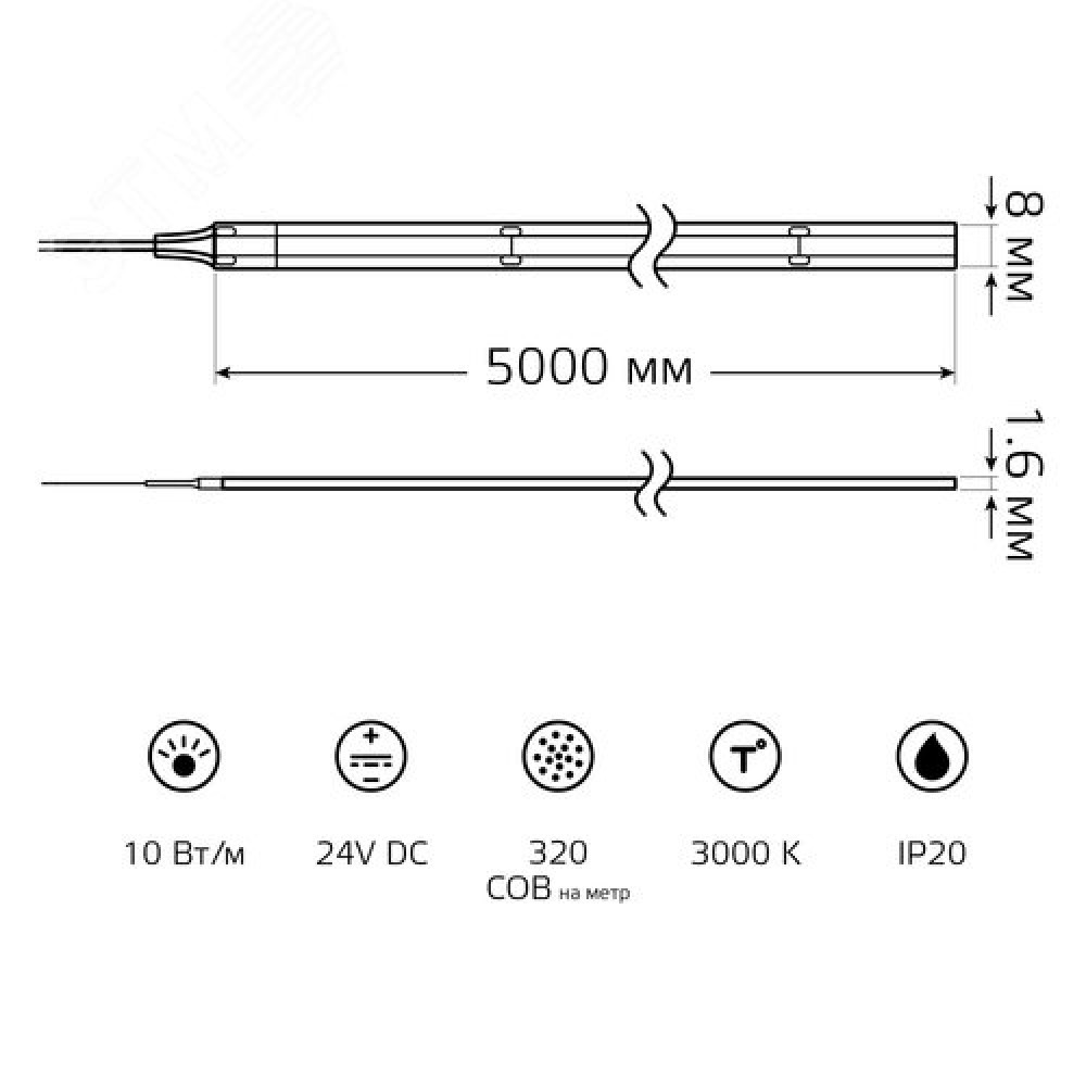 | Длина ленты, м5 | Длина, мм5000 | Дополнительные опцииCOB |