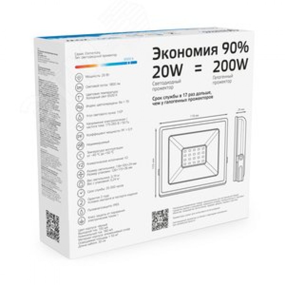 Технические характеристики Прожектор светодиодный ДО 20 Вт 1800 Лм 6500К AC 220В IP65 105х118х27мм Elementary