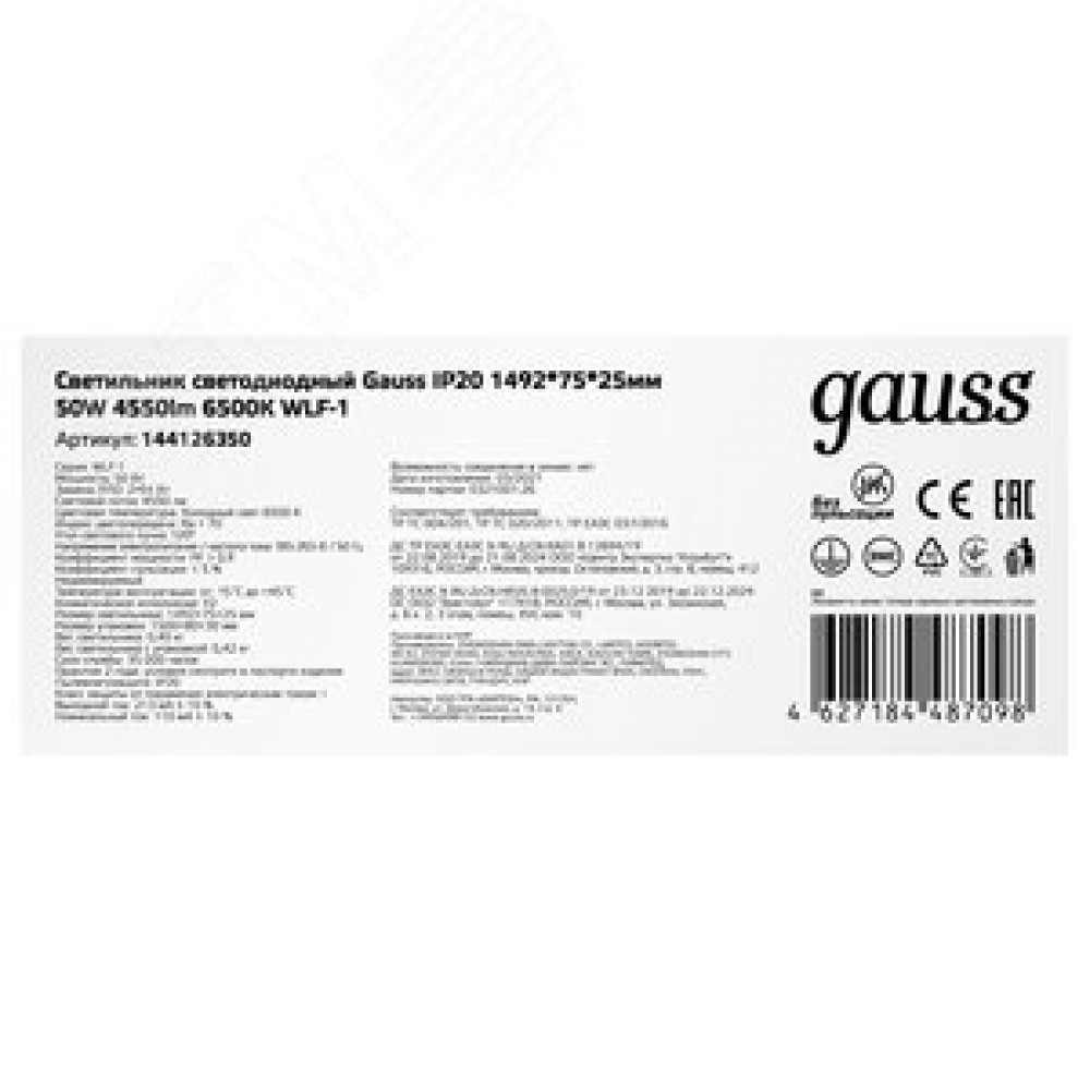 Технические характеристики Светильник светодиодный ДПО 50 Вт 4550 лм 6500К AC 220В IP20 1492х75х25мм матовый опал WLF-1