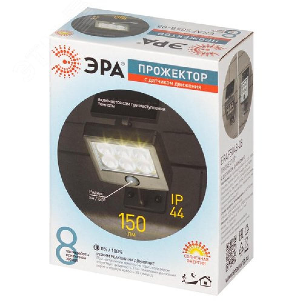 Технические характеристики Прожектор с датчиком движения, на солнечной батарее, 6LED, 150 lm ERAFS048-08