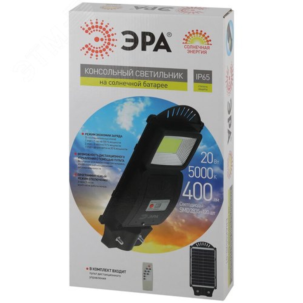 Светильник консольный на солнечной батарее, SMD, 20W, с датчиком движения, ПДУ, 400 lm, 5000К, IP65 0 2826 ₽