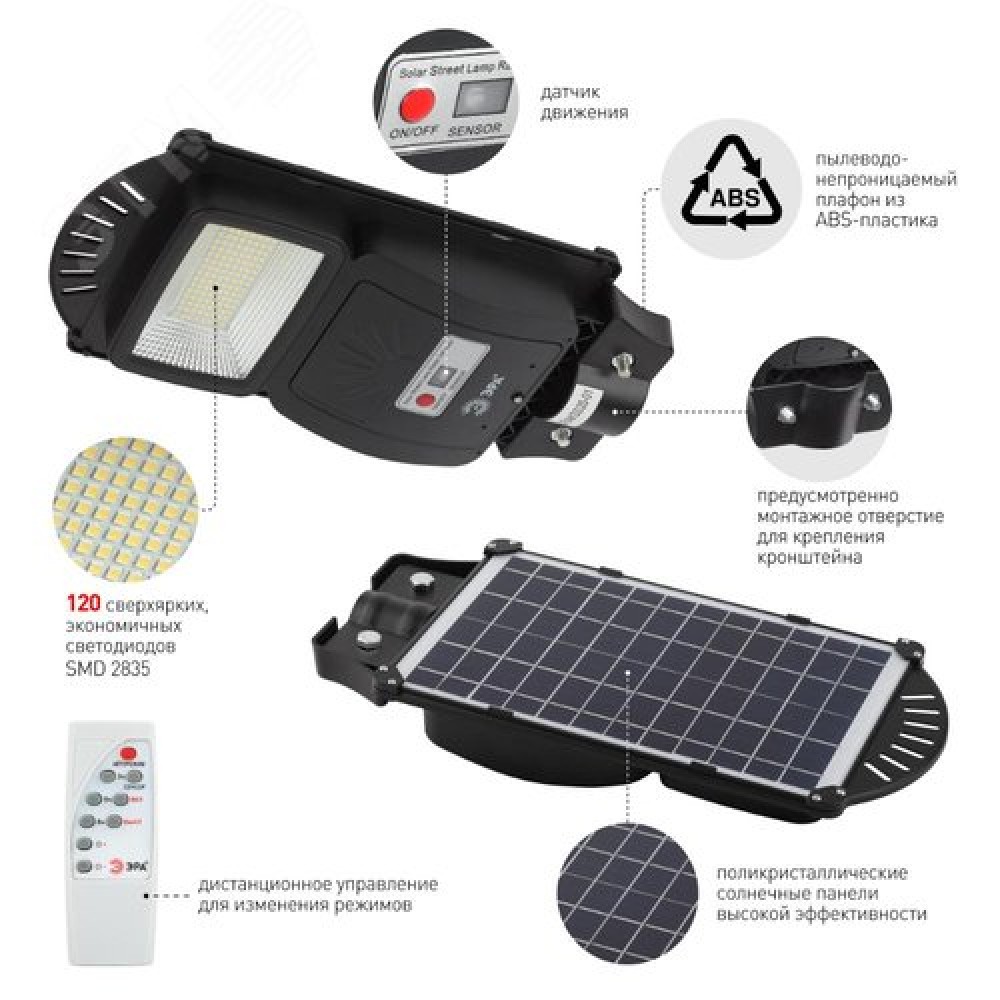 Технические характеристики Светильник консольный на солнечной батарее, SMD, 20W, с датчиком движения, ПДУ, 400 lm, 5000К, IP65
