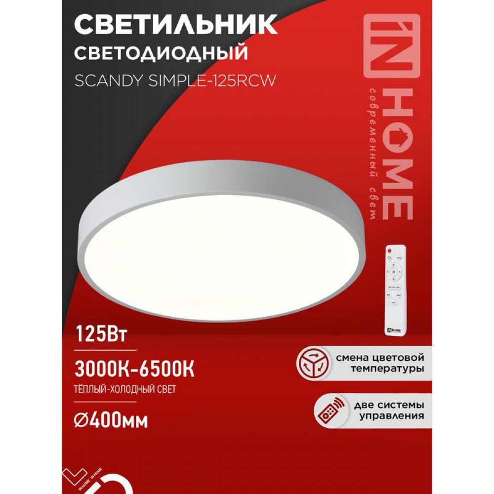 Светильник светодиодный SCANDY SIMPLE-125RCW 125Вт 3000-6500К 10000лм 230В 400х50мм с пультом ДУ бел. IN HOME 4690612062129