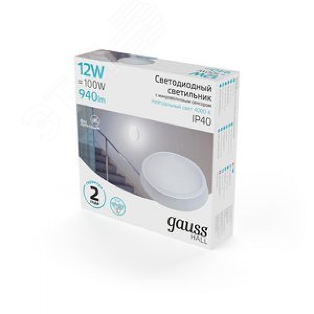 Технические характеристики Светильник светодиодный ДБП 12 Вт 940 лм 4000К AC 220В Белый IP40 круг D135х32мм Пластик ЖКХ с оптико-микроволновым датчиком движения HALL