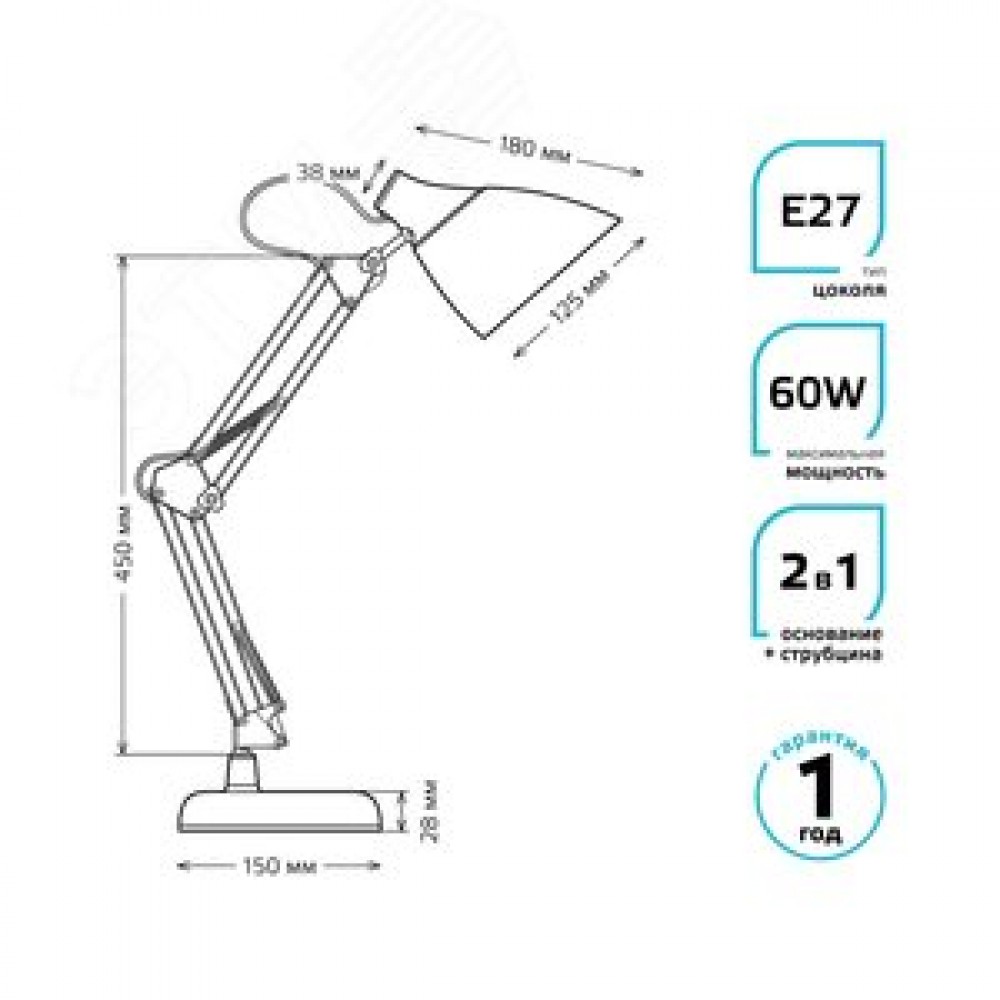 Технические характеристики Светильник настольный под лампу E27 AC 220В Белый IP20 струбцина и основание GTL Gauss