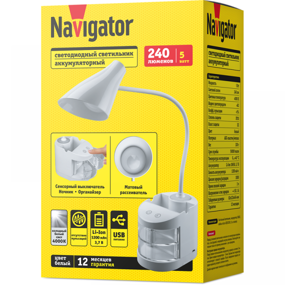 Технические характеристики Светильник светодиодный настольный 93 159 NDF-D036-5W-4K-WH-LED 5Вт 4000К 240лм сенсор USB с подставкой для канц. на основании бел. Navigator 93159