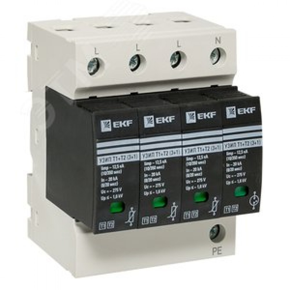 Технические характеристики Устройство защиты от импульсных перенапряжений Т1+Т2 Im-12,5kA In-20kA Uc-275В 3+1 PROxima