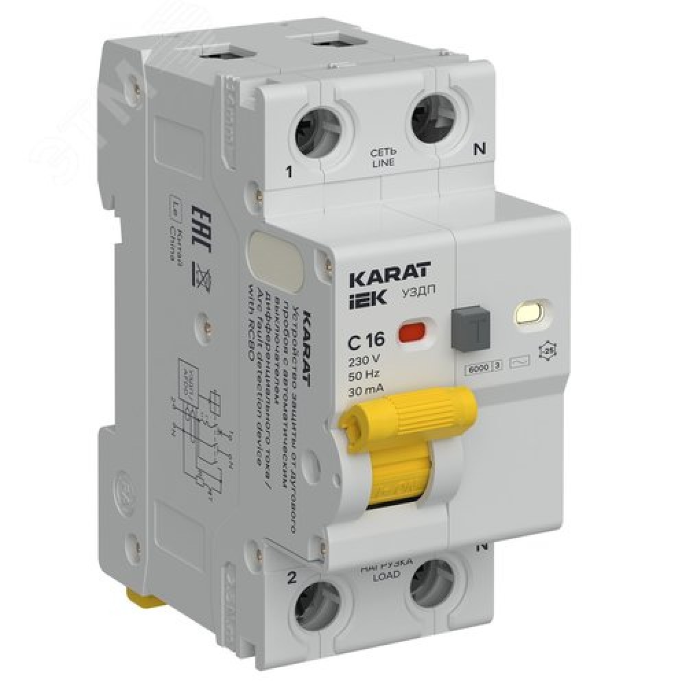 Устройство защиты от дугового пробоя с выключателем автоматическим дифференциального тока 1P+N C 16А 30мА тип A KARAT 0 10389 ₽