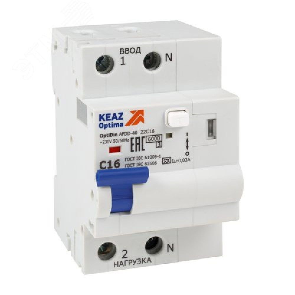 Технические характеристики Устройство защиты от дугового пробоя (УЗДП) с АВДТ и защ. от пов. напряж. OptiDin AFDD-40-22C16-A-У3 (2P, C16, 30mA, Uоткл 275В)