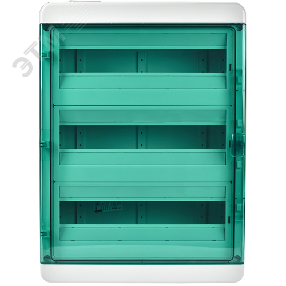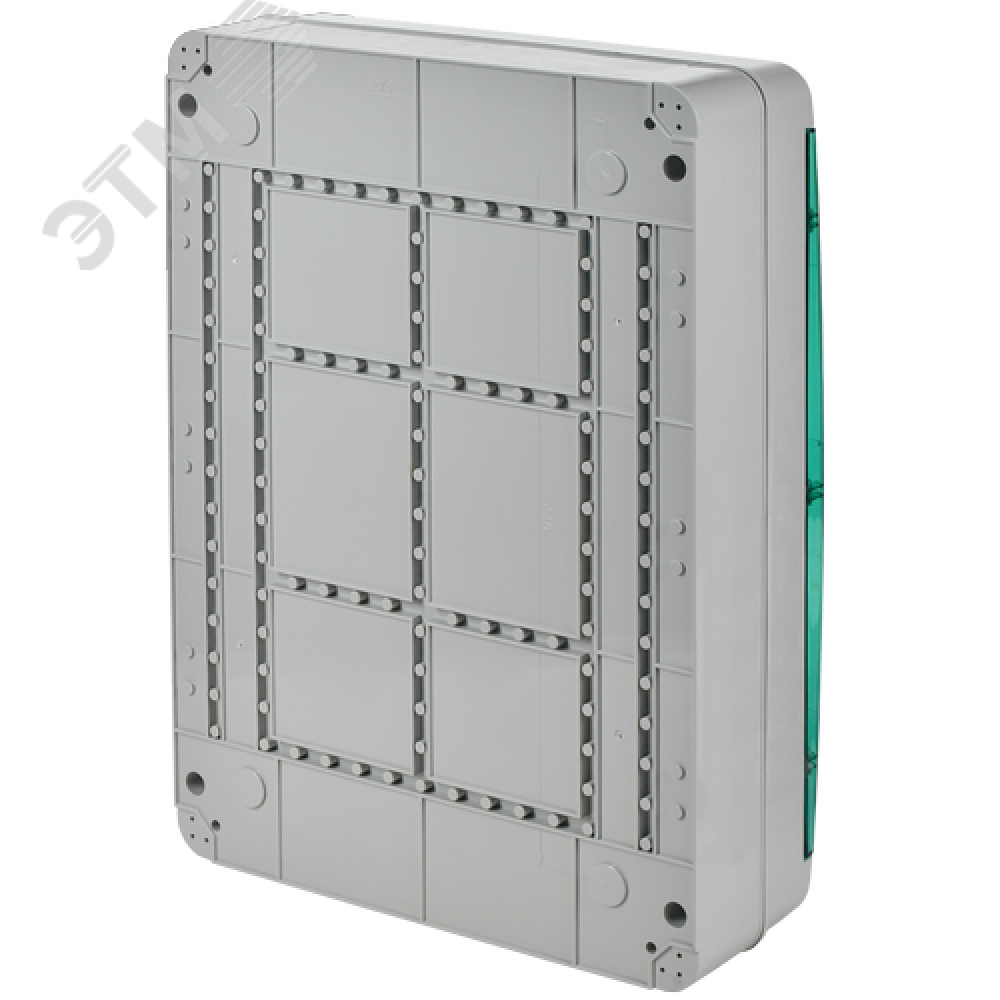 Технические характеристики Корпус пластиковый навесной на 54 модуля КМПн-54 IP65 TEKFOR зеленая прозрачная дверь